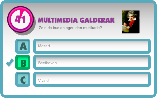 GALDEREN PUNTUAZIOA: Ondo erantzudanko galdera bakoitzeko 100 puntu lortuku dituzu. Gaizki erantzudanko galdera bakoitzeko 40 puntu galduko dituzu. Helmagura zure lehiakideak baino lehemago heltzen bazara eta egiten zaizun galdera zuzen erantzuten baduzu, 500 puntu lortuko dituzu, baina galdera ondo erantzuken ez baduzu, 300 puntu baino ez dituzu lortuko.